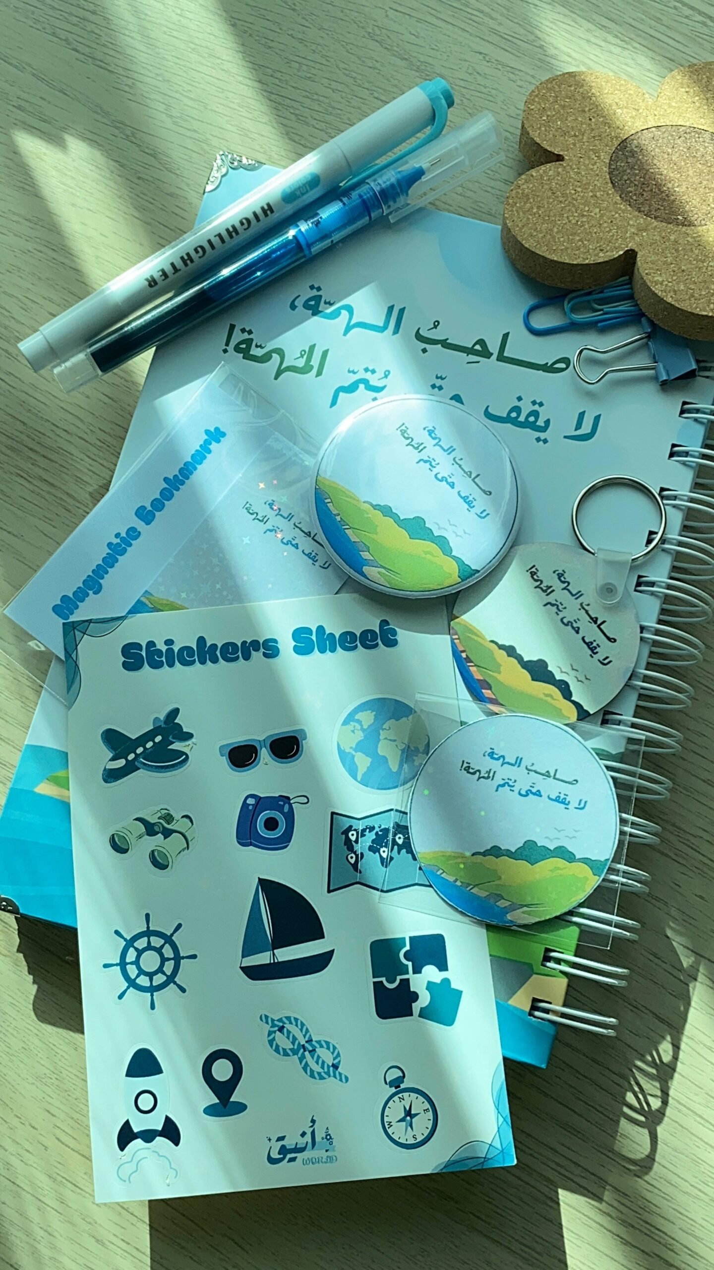 الكولّيكشن يحتوي على العديد من الاضافات المميزة، (ميدالية خشبية حجم 5 cm بطباعة على الوجهين، بروش دائري بحجم 5,8cm، قاطع كتاب مغناطيسي، مجموعة من الكليبسات، ورقة ستيكرز خاصة بالمفكرة، قلم حبر وهايلايتر)