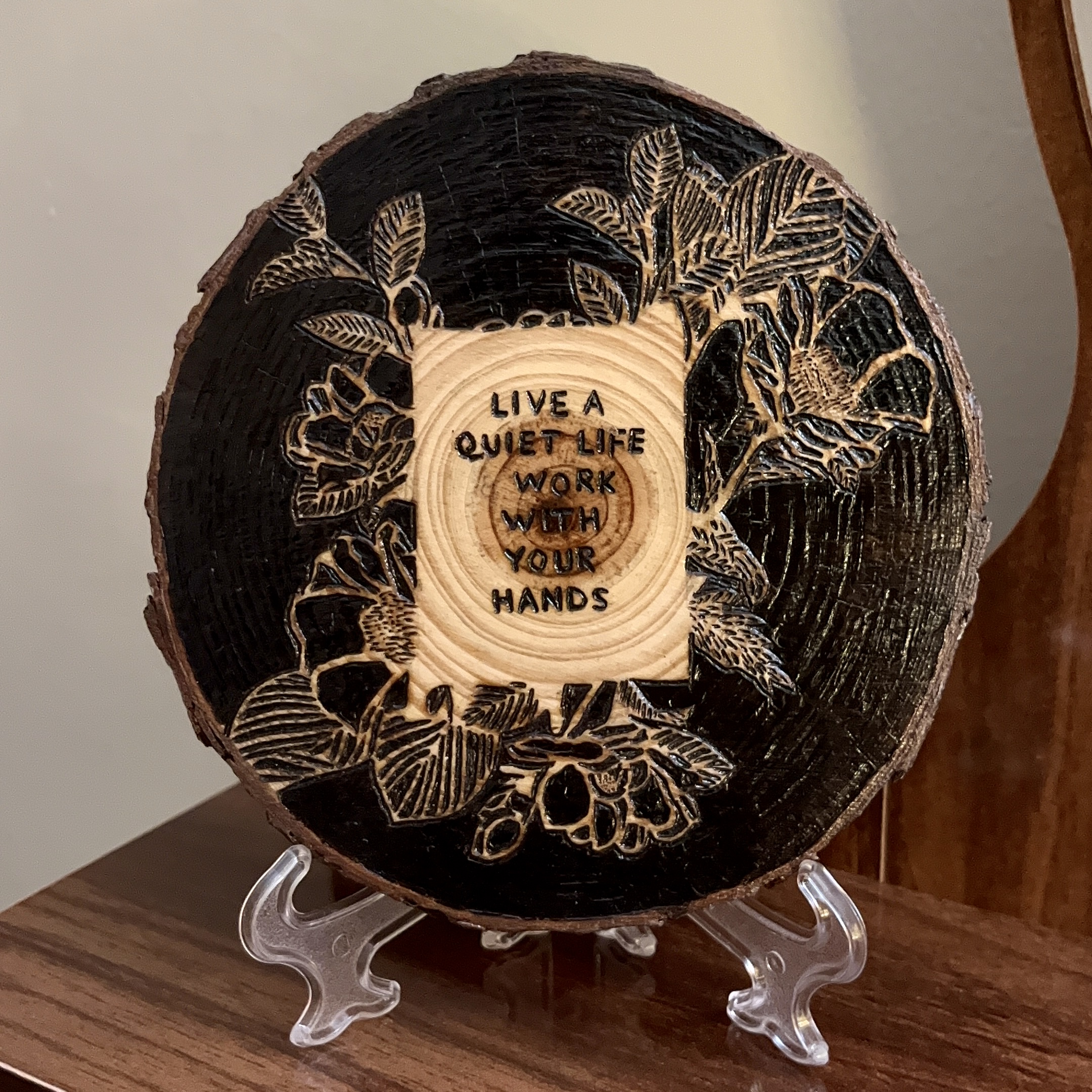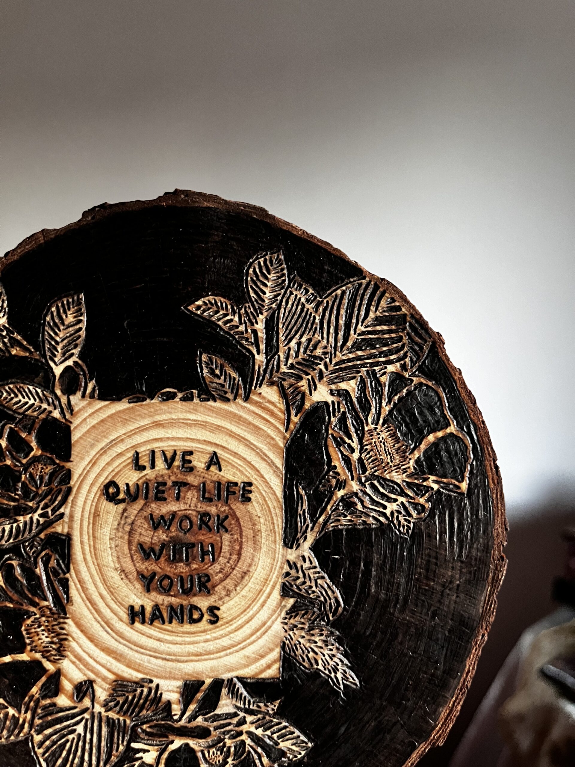 - ديكور منزلي خشبي مرسوم عليه بطريقة الحرق على الخشب